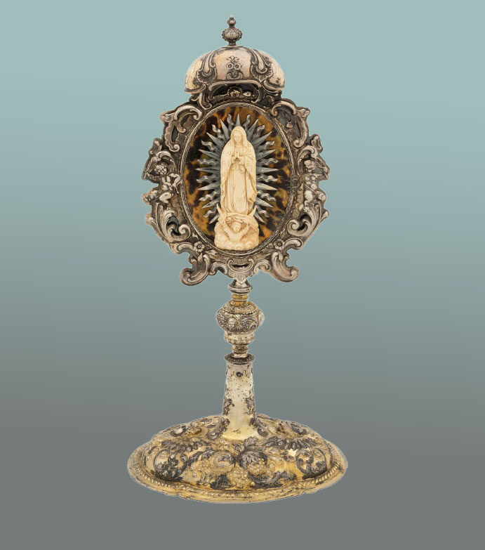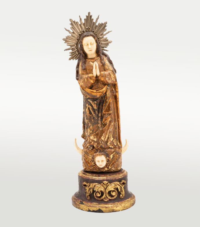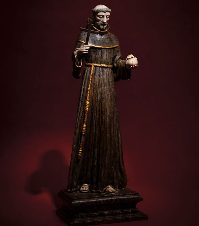 Entre los objetos de esta excepcional categoría que se encuentran en esta subasta, figuran las imágenes religiosas talladas en marfil (lotes 52-61), que denotan la inmensa importancia de la fe al esculpirse sobre uno de los materiales orgánicos más apreciados; una custodia relicario en plata y carey que porta una Virgen de Guadalupe tallada en marfil (lote 49), que demuestra que al buscar recrear la fe no se escatimaba; un retrato de profesión que retrata a una monja capuchina a punto de entregar su vida al camino de la fe; y dos cuadros de dos de los pintores novohispanos más prominentes, cuyos pinceles definirían los modelos de representación de los motivos de la fe en todo el virreinato. Por una parte, un sueño de san José (lote 236) de Nicolás Rodríguez Juárez, último eslabón de una de las dinastías pictóricas más influyentes, y a quien su ferviente fe lo llevaría incluso a recibirse como hombre de Dios. Y por otra, un san Francisco de Paula (lote 101) santo que buscaría alcanzar la fe en la vida anacoreta, del artista José de Ibarra, destacado pintor y activista a favor de las condiciones laborales de sus colegas gremiales durante el virreinato.