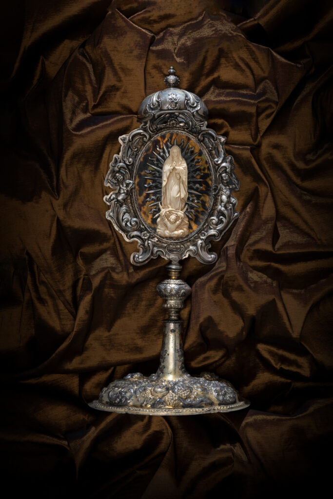 Entre estos objetos excepcionales, destacan las imágenes religiosas talladas en marfil (lotes 52-61), que no solo demuestran una ejecución técnica impecable, sino que reflejan la inmensa importancia de la fe, esculpida en uno de los materiales orgánicos más apreciados. La custodia relicario en plata y carey, que porta una Virgen de Guadalupe tallada en marfil (lote 49), es otro ejemplo de cómo el arte religioso no escatimaba en recursos para recrear la devoción.