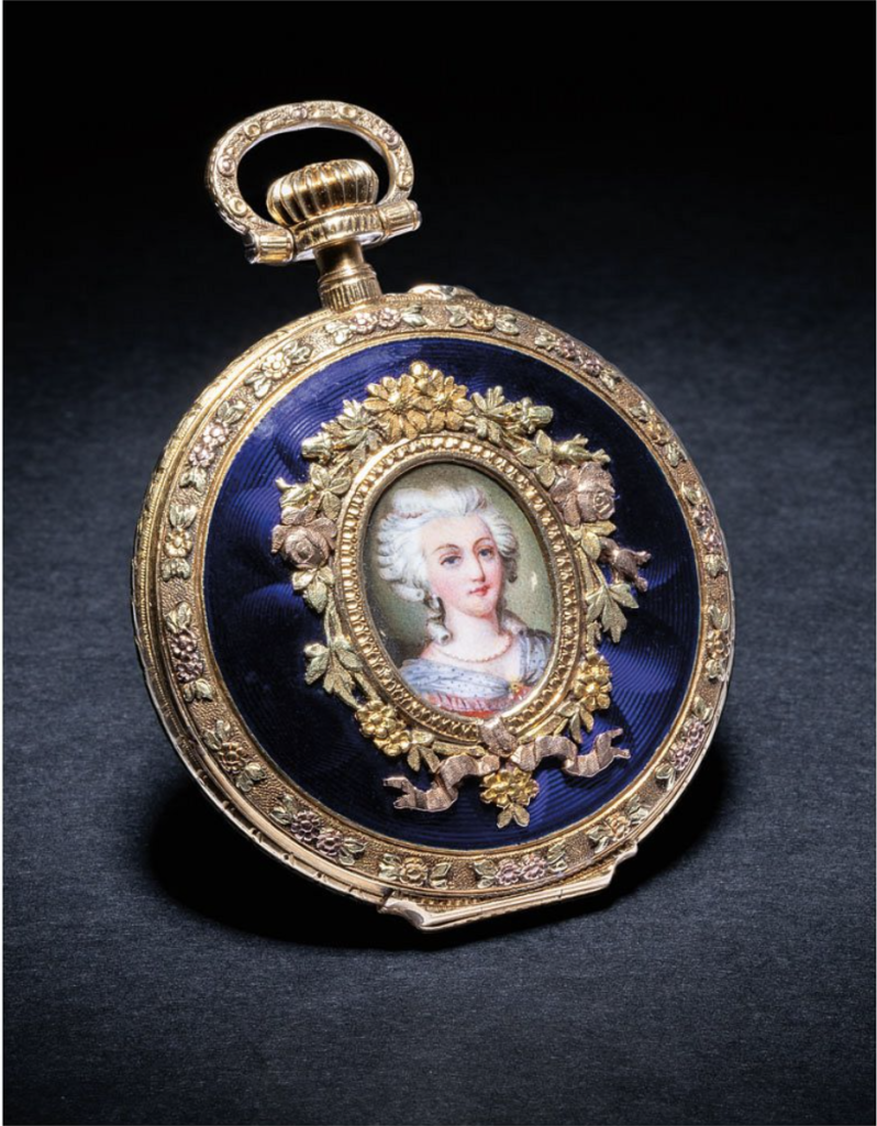 Este reloj no es solo un medidor del tiempo; es un testimonio de la exquisita artesanía del siglo XIX. Su caja circular de 36 mm en oro amarillo de 18K resguarda un mecanismo de movimiento manual de gran precisión. Sin embargo, lo que realmente lo distingue es su detallado esmalte con una pintura en miniatura del retrato de una dama, rodeada de motivos florales sobre un deslumbrante fondo azul guilloché. Cada trazo y cada color reflejan la maestría de los orfebres de la época, quienes lograron plasmar un delicado equilibrio entre lujo y arte.